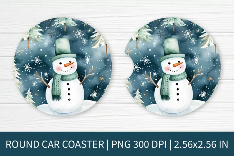 Round Car Coaster Sublimation Design | Christmas Snowman PNG