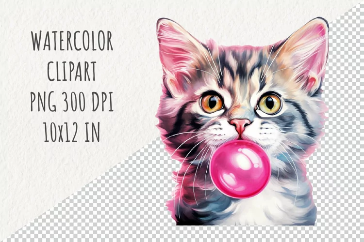 Cat with Gum | Sublimation Design | Watercolor Clipart example image 1