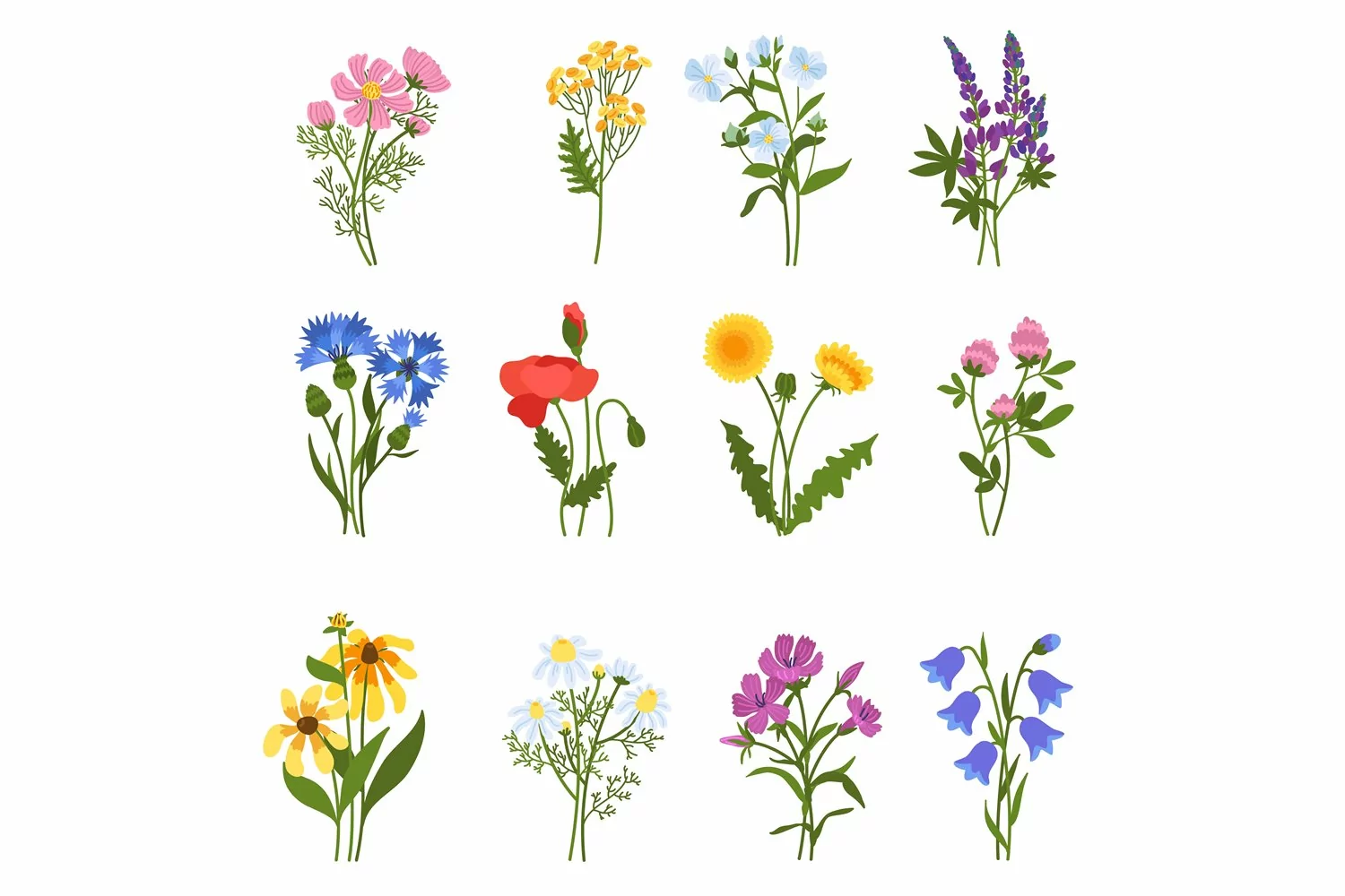 Blooming wild flowers. Beautiful meadow plants, isolated colorful floral elements, spring summer medicinal botany, natural dandelions, poppy and clover, chamomile and cornflower, vector hand drawn set