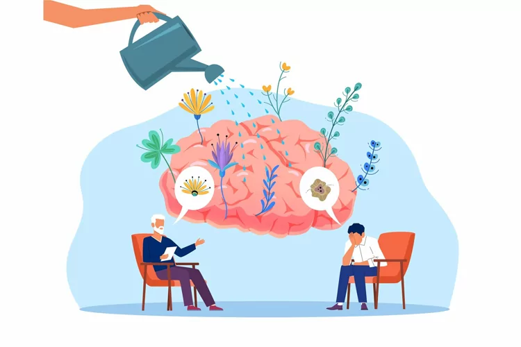Psychological support. Recovery and mental rehabilitation after depression or trauma, doctor helps man solving problems on consultation, brain with flowers, vector cartoon flat psychotherapy concept