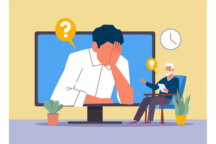 Online consultation. Remote psychological assistance, internet meeting with psychologist, doctor and sad crying man on monitor screen, professional help and support, vector cartoon flat style concept