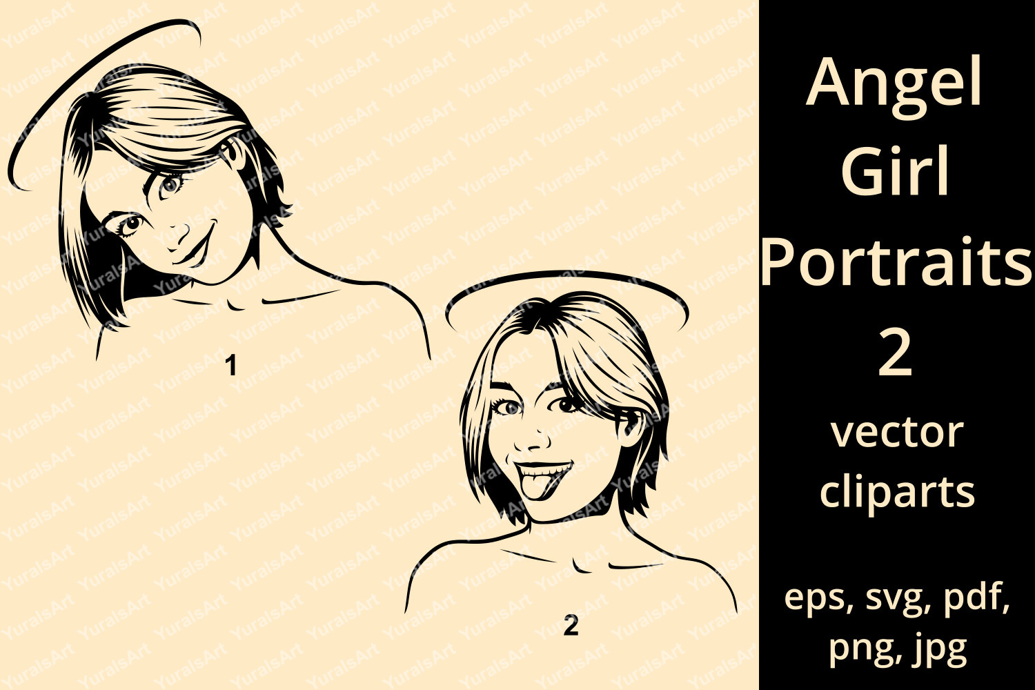 Black and white vector drawings of angel faces. One with sweet smile, the second with playful tongue out. Each one is in the separate file and isolated on white background.
