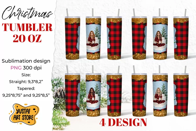 Christmas skinny tumbler 20 oz wrap sublimation mini bundle. 4 design Christmas girl illustration. Buffalo plaid and gold glitter