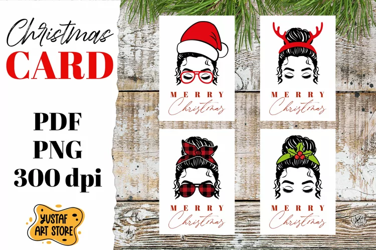 • 4 Christmas card Messy bun illustration 5*7 inch PDF, PNG