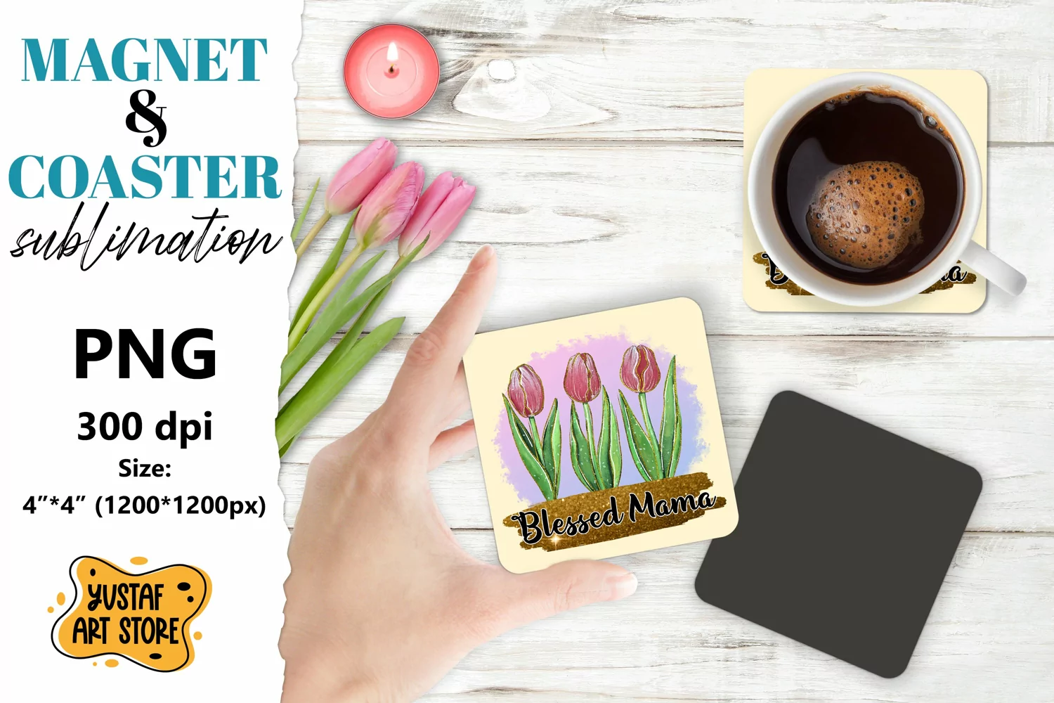 Blessed Mama Flowers Sublimation Mama Sublimation Mothers Day Sublimation Mom Coaster Square Coaster Sublimation Mothers Day Coaster Fridge Magnet Design Mothers Day Magnet Mom Magnet