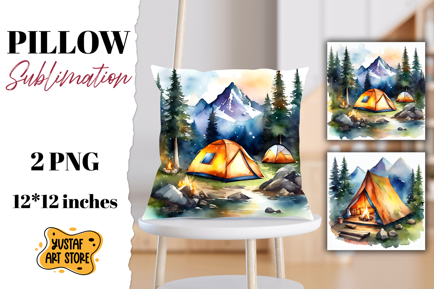 Camping pillow sublimation. Watercolor camping