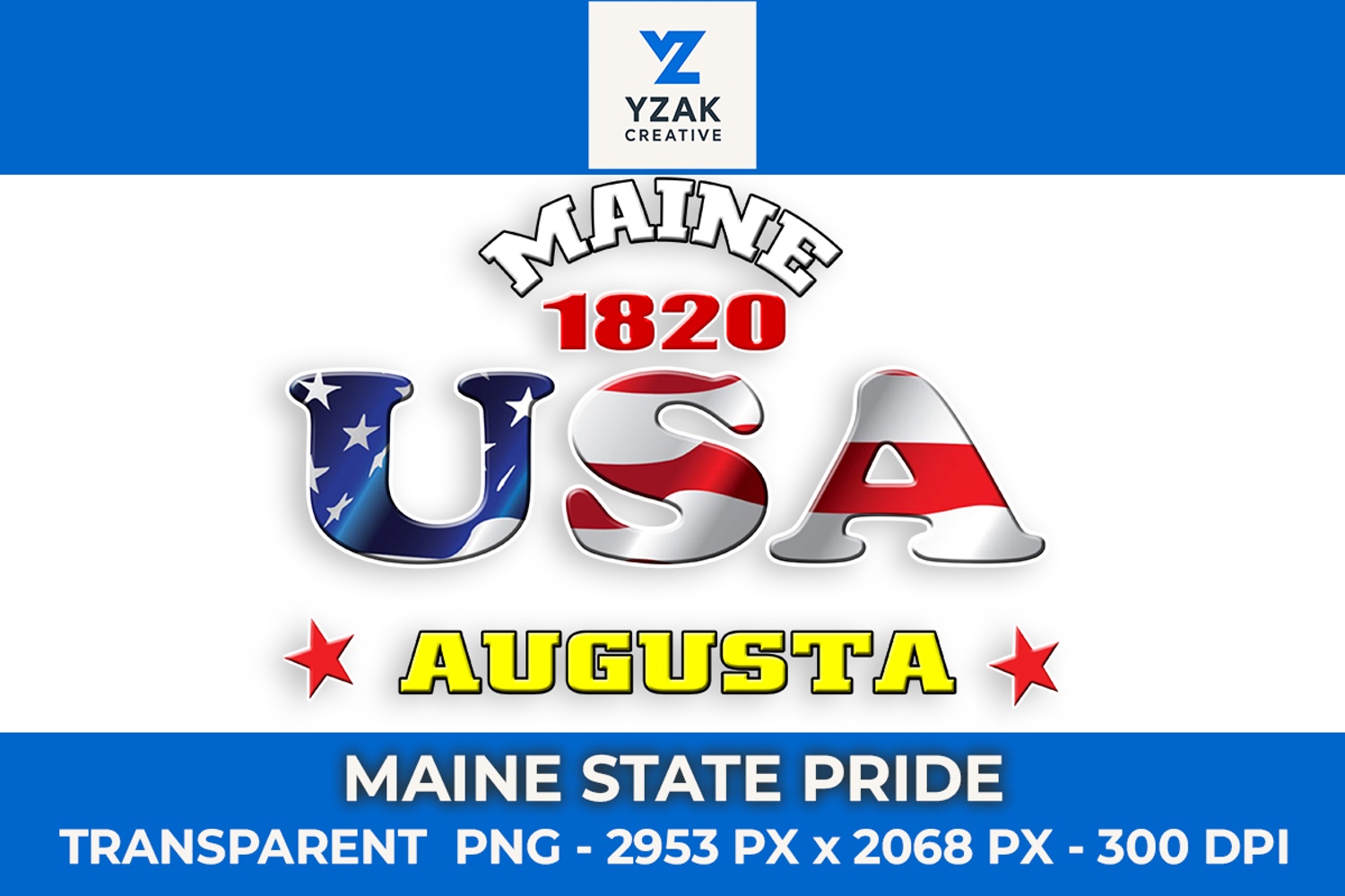 Celebrate American heritage with this bold and patriotic Maine -themed graphic design. Featuring vibrant colors, iconic typography, and symbolic elements like the American flag pattern and statehood year, this high-resolution PNG file is perfect for a wide range of creative and commemorative projects.