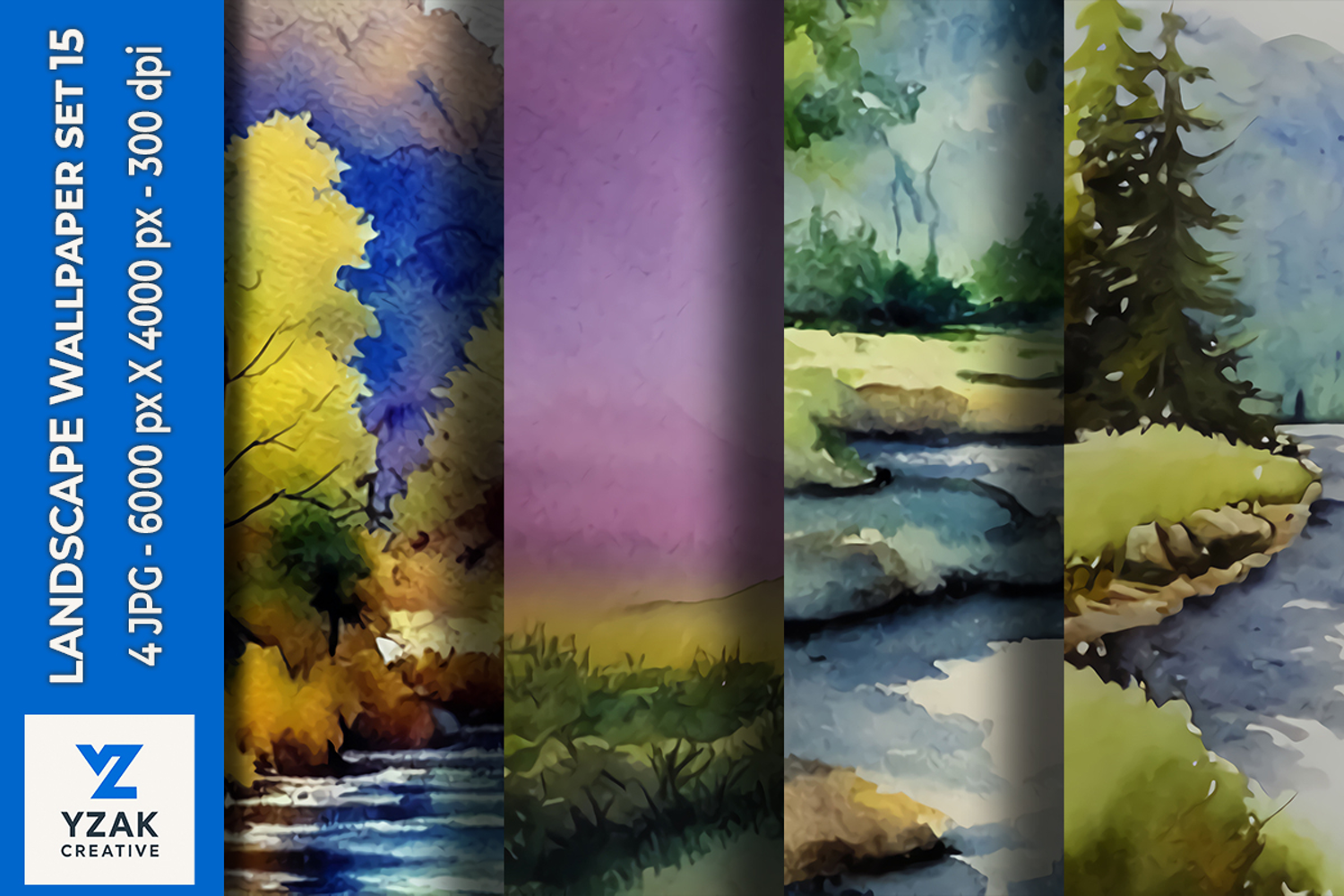 Transform your digital or print projects with this stunning collection of 4 landscape wallpapers, featuring vibrant, painterly scenes inspired by nature’s breathtaking beauty. Each artwork blends watercolor textures and artistic brushstrokes to create a serene and colorful atmosphere. These high-resolution 6000x4000 px (300 DPI) JPG files are perfect for a wide range of creative uses.