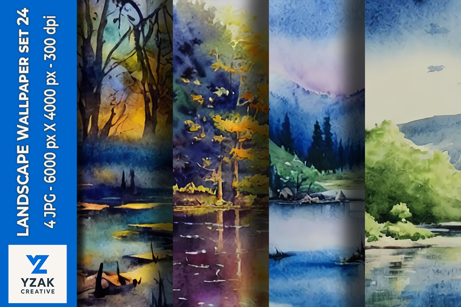 Transform your digital or print projects with this stunning collection of 4 landscape wallpapers, featuring vibrant, painterly scenes inspired by nature’s breathtaking beauty. Each artwork blends watercolor textures and artistic brushstrokes to create a serene and colorful atmosphere. These high-resolution 6000x4000 px (300 DPI) JPG files are perfect for a wide range of creative uses.