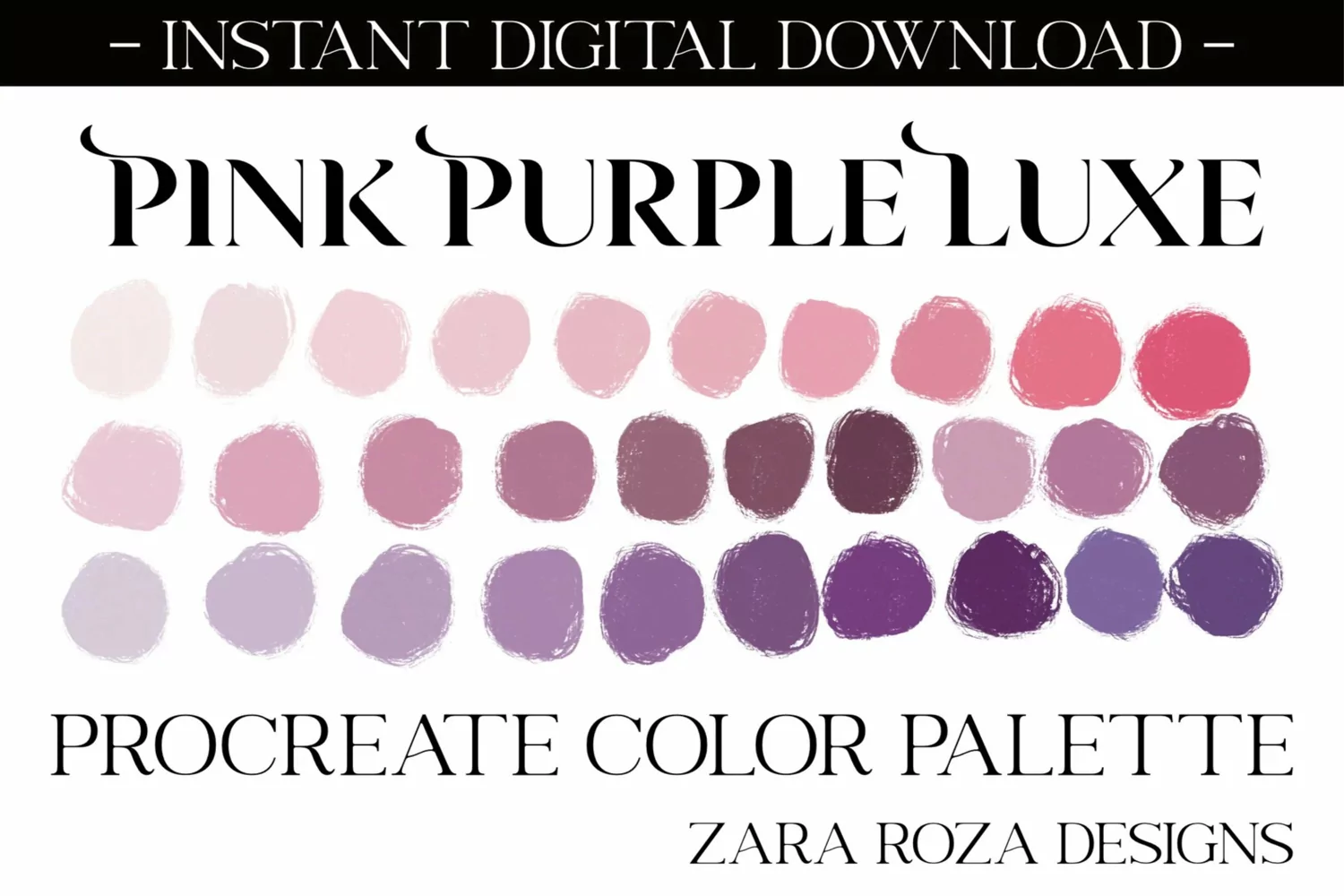 Pink Purple Luxe - A procreate colour / color palette. This app add-on tool is 1 color scheme with 30 swatches, handpicked for a calm, relaxing, hippie, elegant, cute, retro vintage, 70s 80s 90s boho, modern, minimalist, bohemian, travel, wanderlust, retro vintage aesthetic & mood consisting of pink, purple light soft pale pastel tones & shades for drawing, painting, illustrating, portrait art, digital art, graphic design, iPad hand lettering, calligraphy, writing, food, landscape, planning, sketching, logos, prints, layouts, comics, doodling, and more. Also can be used for procreate portraits, faces, character design, costume design, lipstick, eye shadow, lips, eyes, facial makeup, nail art, blush, line art, abstract art, sketches, artwork, illustrations, etc.
