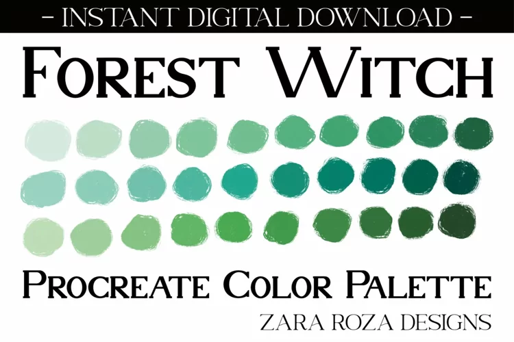 Forest Witch - A procreate colour / color palette. This app add-on tool is 1 color scheme with 30 swatches, handpicked for a calm, relaxing, hippie, elegant, cute, retro vintage, 70s 80s 90s boho, modern, minimalist, bohemian, travel, wanderlust, retro vintage aesthetic & mood consisting of light dark soft pale pastel nature forest natural green tones & shades for drawing, painting, illustrating, portrait art, digital art, graphic design, iPad hand lettering, calligraphy, writing, food, landscape, planning, sketching, logos, prints, layouts, comics, doodling, and more. Also can be used for procreate portraits, faces, character design, costume design, lipstick, eye shadow, lips, eyes, facial makeup, nail art, blush, line art, abstract art, sketches, artwork, illustrations, etc.