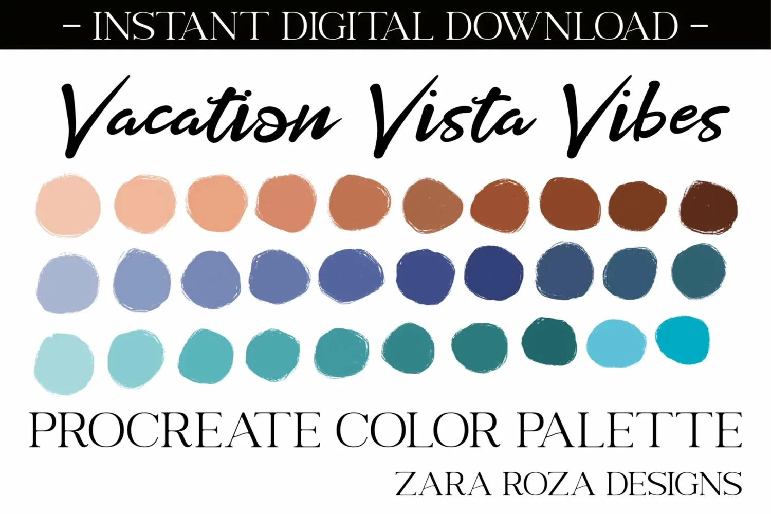 Vacation Vista Vibes - A procreate colour / color palette. This app add-on tool is 1 color scheme with 30 swatches, handpicked for a calm, relaxing, hippie, elegant, cute, retro vintage, 70s 80s 90s boho, modern, minimalist, bohemian, travel, wanderlust, retro vintage aesthetic & mood consisting of light dark soft pale pastel nature ocean beach beige blue natural tones & shades for drawing, painting, illustrating, portrait art, digital art, graphic design, iPad hand lettering, calligraphy, writing, food, landscape, planning, sketching, logos, prints, layouts, comics, doodling, and more. Also can be used for procreate portraits, faces, character design, costume design, lipstick, eye shadow, lips, eyes, facial makeup, nail art, blush, line art, abstract art, sketches, artwork, illustrations, etc.