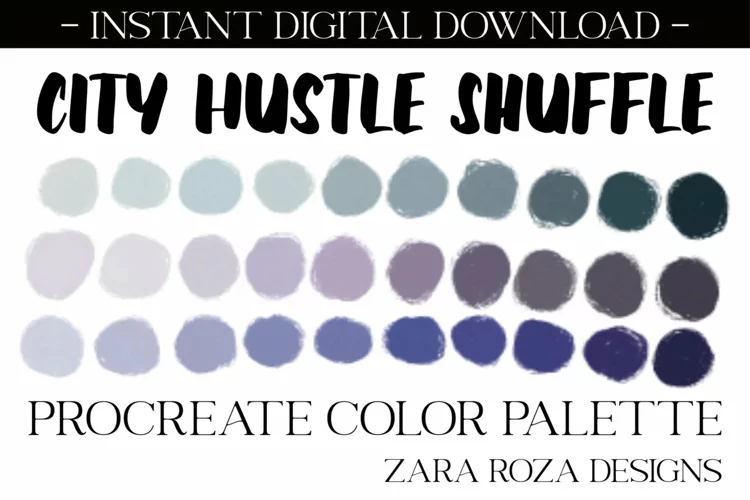 City Hustle Shuffle - A procreate colour / color palette. This app add-on tool is 1 color scheme with 30 swatches, handpicked for a calm, relaxing, hippie, elegant, cute, retro vintage, 70s 80s 90s boho, modern, minimalist, bohemian, travel, wanderlust, retro vintage aesthetic & mood consisting of tones & shades for drawing, painting, illustrating, portrait art, digital art, graphic design, iPad hand lettering, calligraphy, writing, food, landscape, planning, sketching, logos, prints, layouts, comics, doodling, and more. Also can be used for procreate portraits, faces, character design, costume design, lipstick, eye shadow, lips, eyes, facial makeup, nail art, blush, line art, abstract art, sketches, artwork, illustrations, etc.