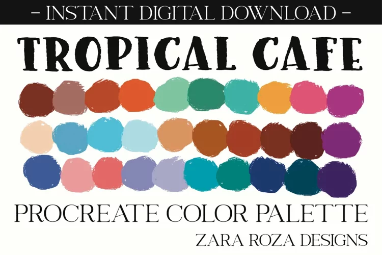 Tropical Cafe - A Procreate colour / color palette. This app add-on tool is 1 color scheme with 30 swatches, handpicked for a calm, relaxing, hippie, elegant, cute, retro vintage, 70s 80s 90s boho, modern, minimalist, bohemian, travel, wanderlust, retro vintage aesthetic & mood consisting of grey / gray tones & shades for drawing, painting, illustrating, portrait art, digital art, graphic design, iPad hand lettering, calligraphy, writing, food, landscape, planning, sketching, logos, prints, layouts, comics, doodling, and more. Also can be used for procreate portraits, faces, character design, costume design, lipstick, eye shadow, lips, eyes, facial makeup, nail art, blush, line art, abstract art, sketches, artwork, illustrations, etc.
