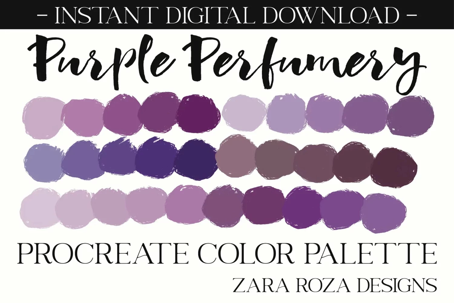 Purple Perfumery - A Procreate colour / color palette. This app add-on tool is 1 color scheme with 30 swatches, handpicked for a calm, relaxing, hippie, elegant, cute, retro vintage, 70s 80s 90s boho, modern, minimalist, bohemian, travel, wanderlust, retro vintage aesthetic & mood consisting of grey / gray tones & shades for drawing, painting, illustrating, portrait art, digital art, graphic design, iPad hand lettering, calligraphy, writing, food, landscape, planning, sketching, logos, prints, layouts, comics, doodling, and more. Also can be used for procreate portraits, faces, character design, costume design, lipstick, eye shadow, lips, eyes, facial makeup, nail art, blush, line art, abstract art, sketches, artwork, illustrations, etc.