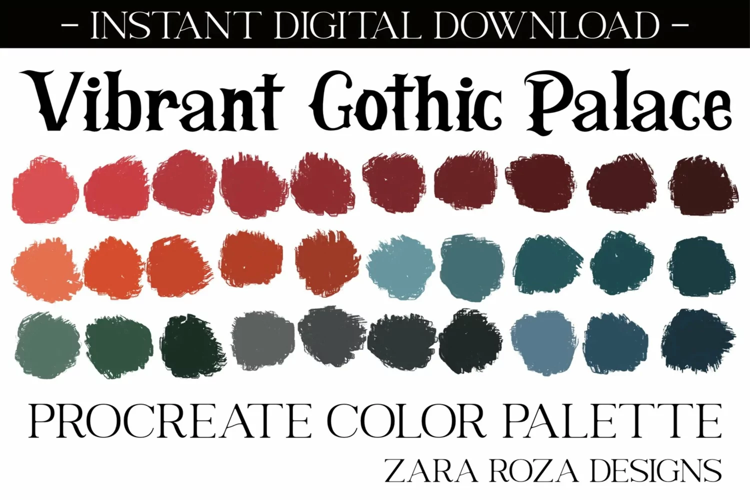 Vibrant Gothic Palace - A Procreate colour / color palette. This app add-on tool is 1 color scheme with 30 swatches, handpicked for a calm, relaxing, hippie, elegant, cute, retro vintage, 70s 80s 90s boho, modern, minimalist, bohemian, travel, wanderlust, retro vintage aesthetic & mood consisting of grey / gray tones & shades for drawing, painting, illustrating, portrait art, digital art, graphic design, iPad hand lettering, calligraphy, writing, food, landscape, planning, sketching, logos, prints, layouts, comics, doodling, and more. Also can be used for procreate portraits, faces, character design, costume design, lipstick, eye shadow, lips, eyes, facial makeup, nail art, blush, line art, abstract art, sketches, artwork, illustrations, etc.