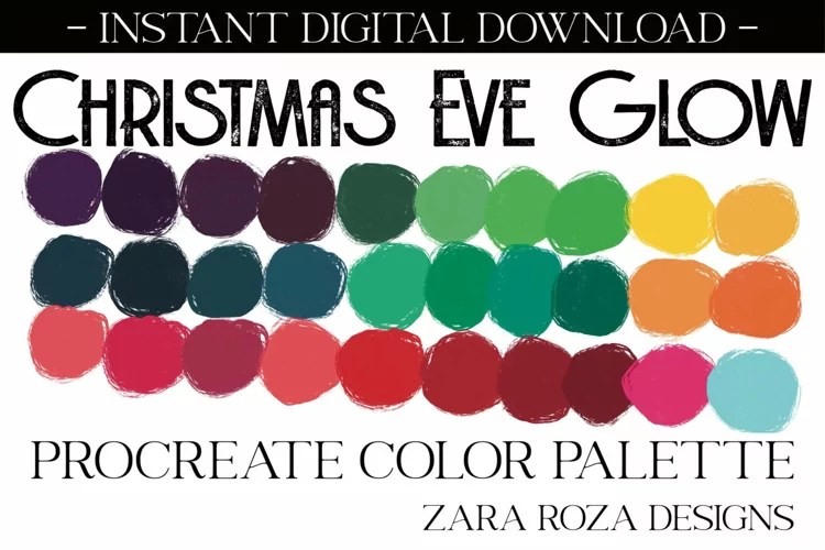 Christmas Eve Glow - A Procreate colour / color palette. This app add-on tool is 1 color scheme with 30 swatches, handpicked for a calm, relaxing, hippie, elegant, cute, retro vintage, 70s 80s 90s boho, modern, minimalist, bohemian, travel, wanderlust, retro vintage aesthetic & mood consisting of grey / gray tones & shades for drawing, painting, illustrating, portrait art, digital art, graphic design, iPad hand lettering, calligraphy, writing, food, landscape, planning, sketching, logos, prints, layouts, comics, doodling, and more. Also can be used for procreate portraits, faces, character design, costume design, lipstick, eye shadow, lips, eyes, facial makeup, nail art, blush, line art, abstract art, sketches, artwork, illustrations, etc.
