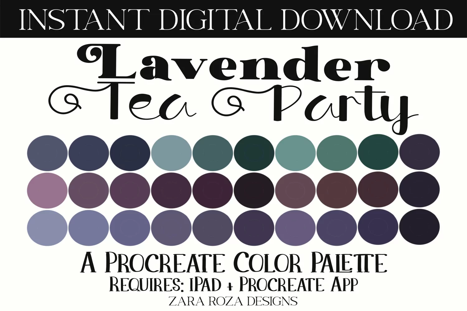 Lavender Tea Party - A Procreate colour / color palette. This app add-on tool is 1 pastel, light, dark, retro vintage purple blue color scheme with 30 swatches, handpicked for a calm, relaxing, hippie, elegant, cute, retro vintage, 70s 80s 90s boho, modern, minimalist, bohemian, travel, wanderlust, retro vintage aesthetic & mood consisting of grey / gray tones & shades for drawing, painting, illustrating, portrait art, digital art, graphic design, iPad hand lettering, calligraphy, writing, food, landscape, planning, sketching, logos, prints, layouts, comics, doodling, and more. Also can be used for procreate portraits, faces, character design, costume design, lipstick, eye shadow, lips, eyes, facial makeup, nail art, blush, line art, abstract art, sketches, artwork, illustrations, etc.