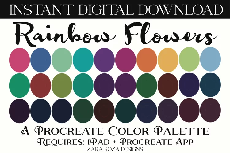 Rainbow Flowers - A Procreate colour / color palette. This app add-on tool is 1 color scheme with 30 swatches, handpicked for a calm, relaxing, hippie, elegant, cute, retro vintage, 70s 80s 90s boho, modern, minimalist, bohemian, travel, wanderlust, goth, gothic vibes, cute retro vintage aesthetic & mood consisting of light dark pink, blue, green, teal, turquoise, purple, iris, mauve, violet, magenta, pink, brown tones & shades for drawing, painting, illustrating, portrait art, digital art, graphic design, iPad hand lettering, calligraphy, writing, food, landscape, planning, sketching, logos, prints, layouts, comics, doodling, and more. Also can be used for procreate portraits, faces, character design, costume design, lipstick, eye shadow, lips, eyes, facial makeup, nail art, blush, line art, abstract art, sketches, artwork, illustrations, etc.