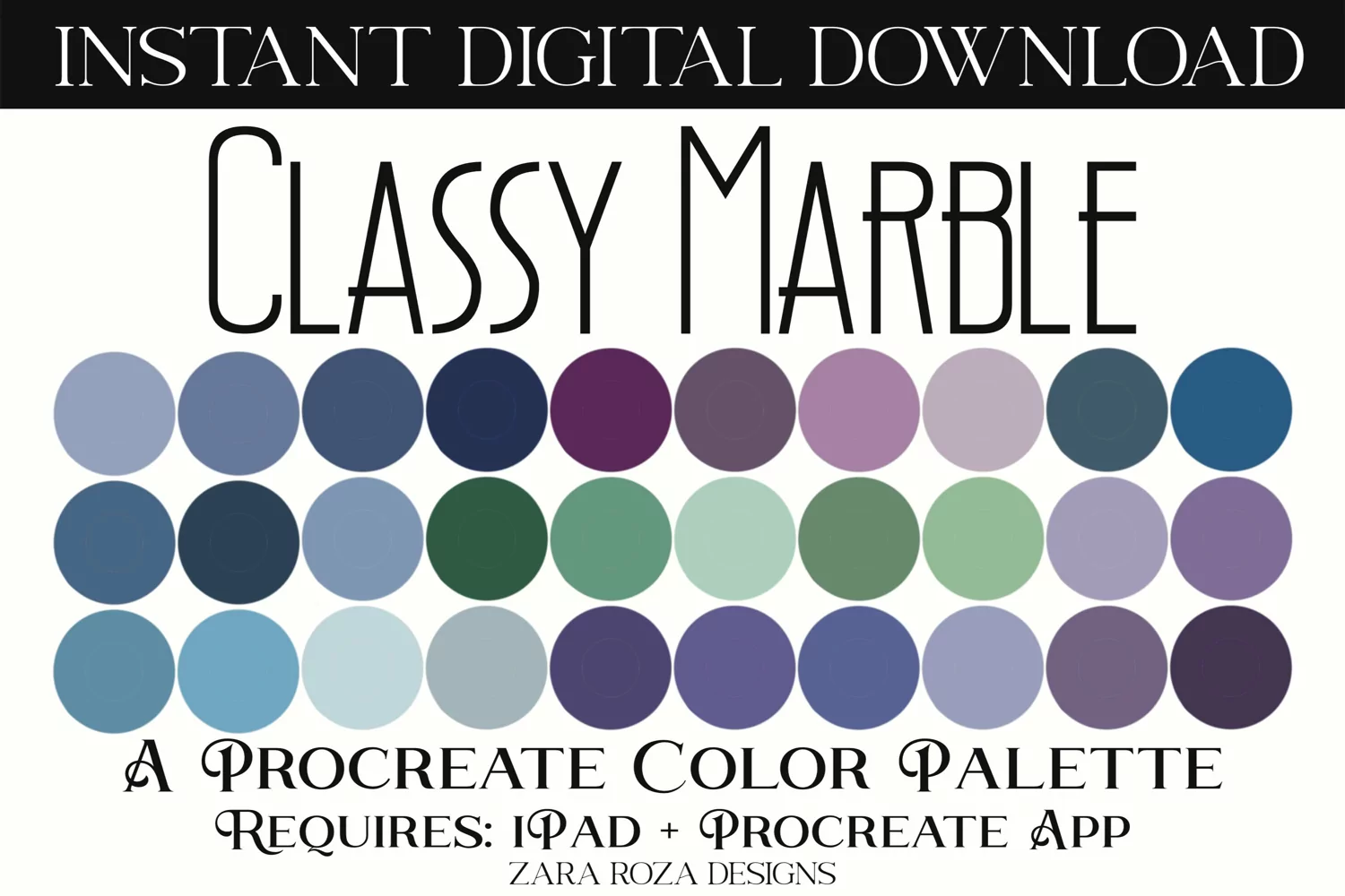 Classy Marble – A Procreate colour / color palette. This app add-on tool is 1 color scheme with 30 swatches, handpicked for a calm, relaxing, elegant, cute, retro vintage, boho, modern, minimalist, bohemian, travel, wanderlust, retro vintage aesthetic & mood consisting of light, dark, bright, pastel blue, purple, teal, turquoise, green tones & shades for drawing, painting, illustrating, portrait art, digital art, graphic design, iPad hand lettering, calligraphy, writing, food, landscape, planning, sketching, logos, prints, layouts, comics, doodling, and more. Also can be used for procreate portraits, faces, character design, costume design, lipstick, eye shadow, lips, eyes, facial makeup, nail art, blush, line art, abstract art, sketches, artwork, illustrations, etc.