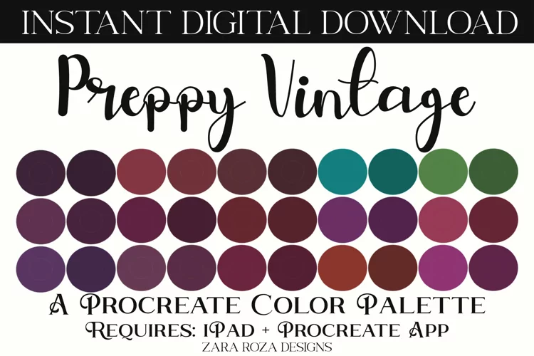 Preppy Vintage – A Procreate colour / color palette. This app add-on tool is 1 color scheme with 30 swatches, handpicked for a calm, relaxing, elegant, cute, retro vintage, boho, modern, minimalist, bohemian, travel, wanderlust, retro vintage aesthetic & mood consisting of light, Victorian, Art Deco, fancy, classy magenta purple, teal, turquoise, green, brown tones & shades for drawing, painting, illustrating, portrait art, digital art, graphic design, iPad hand lettering, calligraphy, writing, fashion, characters, nail art, nature colors, natural landscape, food art, planning, sketching, logos, prints, layouts, comics, doodling, and more. Also can be used for procreate portraits, faces, character design, costume design, lipstick, eye shadow, lips, eyes, facial makeup, nail art, blush, line art, abstract art, sketches, artwork, illustrations, etc.
