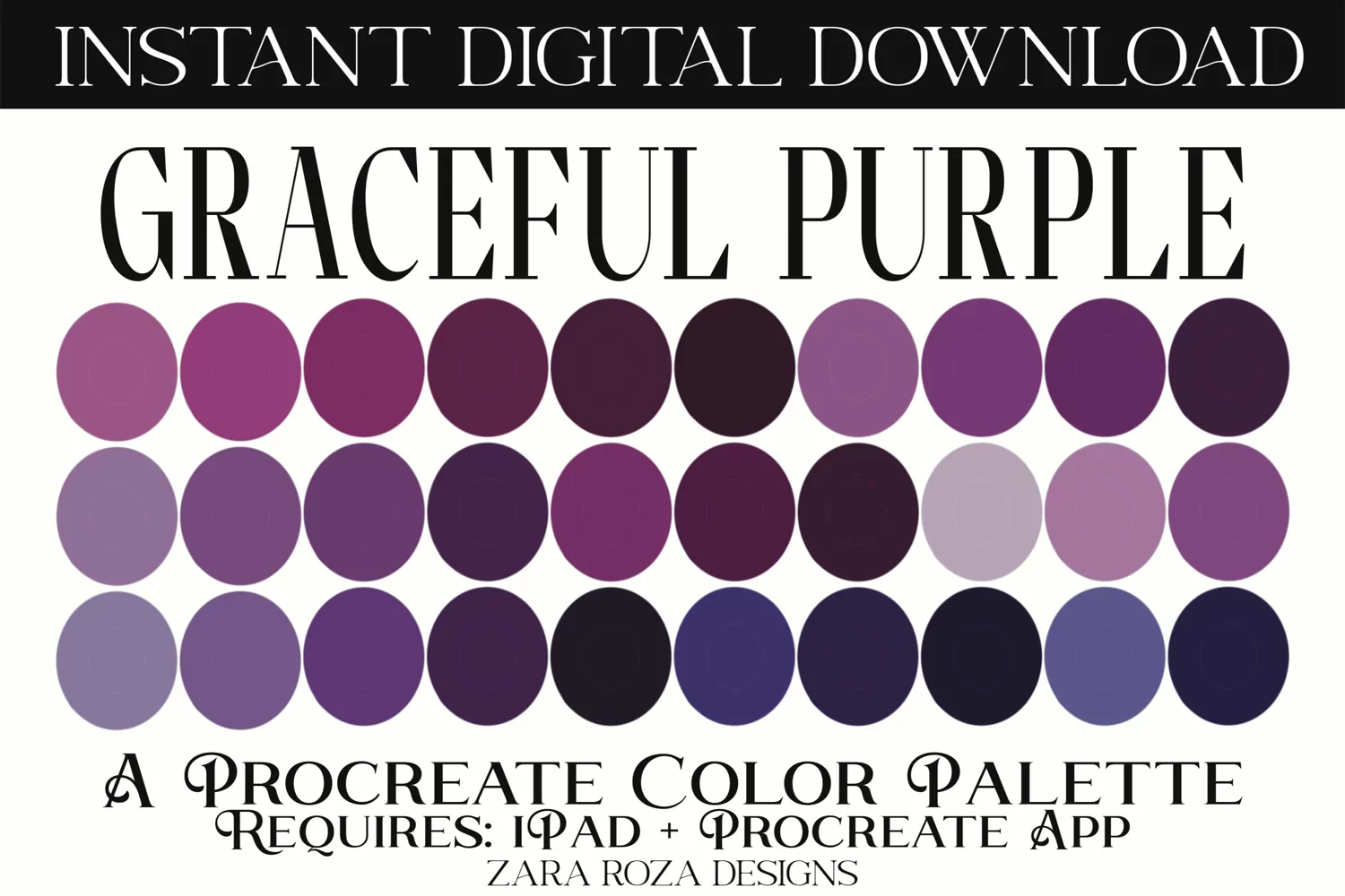 Graceful Purple – A procreate colour / color palette. This app add-on tool is 1 color scheme with 30 swatches, handpicked for a calm, relaxing, hippie, elegant, cute, retro vintage, 70s 80s 90s boho, Halloween, trick or treat, Halloween night, sky, fantasy, witch, witchy, fairy, classy, adorable, modern, minimalist, bohemian, travel, wanderlust, retro vintage aesthetic & mood consisting of purple, mauve, lavender, violet, iris, aubergine light soft pale pastel, dark tones & shades for drawing, painting, illustrating, portrait art, digital art, graphic design, iPad hand lettering, calligraphy, writing, food, landscape, planning, sketching, logos, prints, layouts, comics, doodling, and more. Also can be used for procreate portraits, faces, character design, costume design, lipstick, eye shadow, lips, eyes, facial makeup, nail art, blush, line art, abstract art, sketches, artwork, illustrations, etc.