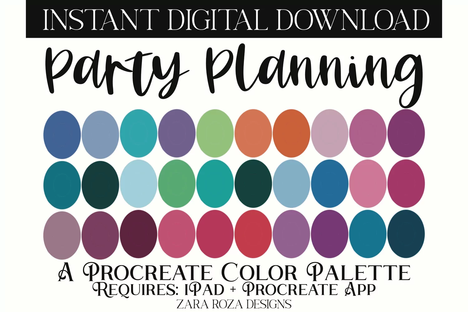 Party Planning – A Procreate colour / color palette. This app add-on tool is 1 color scheme with 30 swatches, handpicked for a calm, relaxing, city, shop or store aesthetic, urban style, fashion, elegant, cute, sweet, adorable, 70s, 80s, 90s retro, boho, bohemian, travel, wanderlust, sweet, kawaii, flower, floral, earthy, garden, grass, tree, forest, landscape, natural, nature, mermaid, ocean, sea, grass, trees, vintage, terrace & rooftop garden, gothic, abstract, back to school, student, teacher, university, uni, college, modern architecture, picnic vibes, aesthetic & mood consisting of rainbow pastel, light, bold, dark, pale, muted, soft, subtle, bright, assortment of blue, teal, turquoise, orange, brown, aubergine, purple, mauve, lilac, violet, pink, red and green tones & shades for sketching, painting, illustrating, portrait art, digital art, graphic design, abstract art, cartoon, anime, manga, landscape art, food art, stippling, various styles of art, iPad & iPad hand lettering, illustrations with the Apple Pencil, calligraphy, writing, fashion, characters, nail art, nature, natural landscape, food art, planning, sketching, logos, prints, layouts, cartoons, comics, doodling, for events like Halloween, Christmas, Thanksgiving, weddings, baby showers, birthday parties, festive celebrations through the Summer, Autumn, Fall, Winter, Spring seasons. The palette can also be used for procreate portrait art, faces, character design, costume design, lipstick, eye shadow, lips, eyes, facial makeup, nail art, blush, line art, abstract art, sketches, artwork, illustrations, etc.