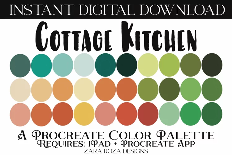 Cottage Kitchen - A Procreate colour / color palette. This app add-on tool is 1 color scheme with 30 swatches, handpicked light pale pastel, dark green, orange, brown tones for Halloween pumpkin party, Thanksgiving feast festivities, a calm, relaxing, hippie, bright Halloween trick or treat spooky, scary, quirky, magic, witch, wizard, sorcerer, fairy magical vibes, sunny summer, spring, winter, fall, autumn, earthy tones, elegant, cute, retro vintage, 70s 80s 90s boho, modern, minimalist, bohemian, travel, wanderlust, aesthetic & mood consisting of tones & shades for drawing, painting, illustrating, portrait art, digital art, graphic design, iPad hand lettering, calligraphy, writing, food, landscape, planning, sketching, logos, prints, layouts, comics, doodling, and more. Also can be used for procreate portraits, faces, eyes, eye shadow, lips, lipstick, hair colors, character design, costume design, lipstick, eye shadow, lips, eyes, facial makeup, nail art, blush, line art, abstract art, fashion design, character art, backgrounds, scrapbook elements, social media, Facebook, Twitter, Instagram, branding, logos, business cards, posts, drawing, doodling, illustrating, painting, digital illustration & lettering. sketches, artwork, illustrations, etc.