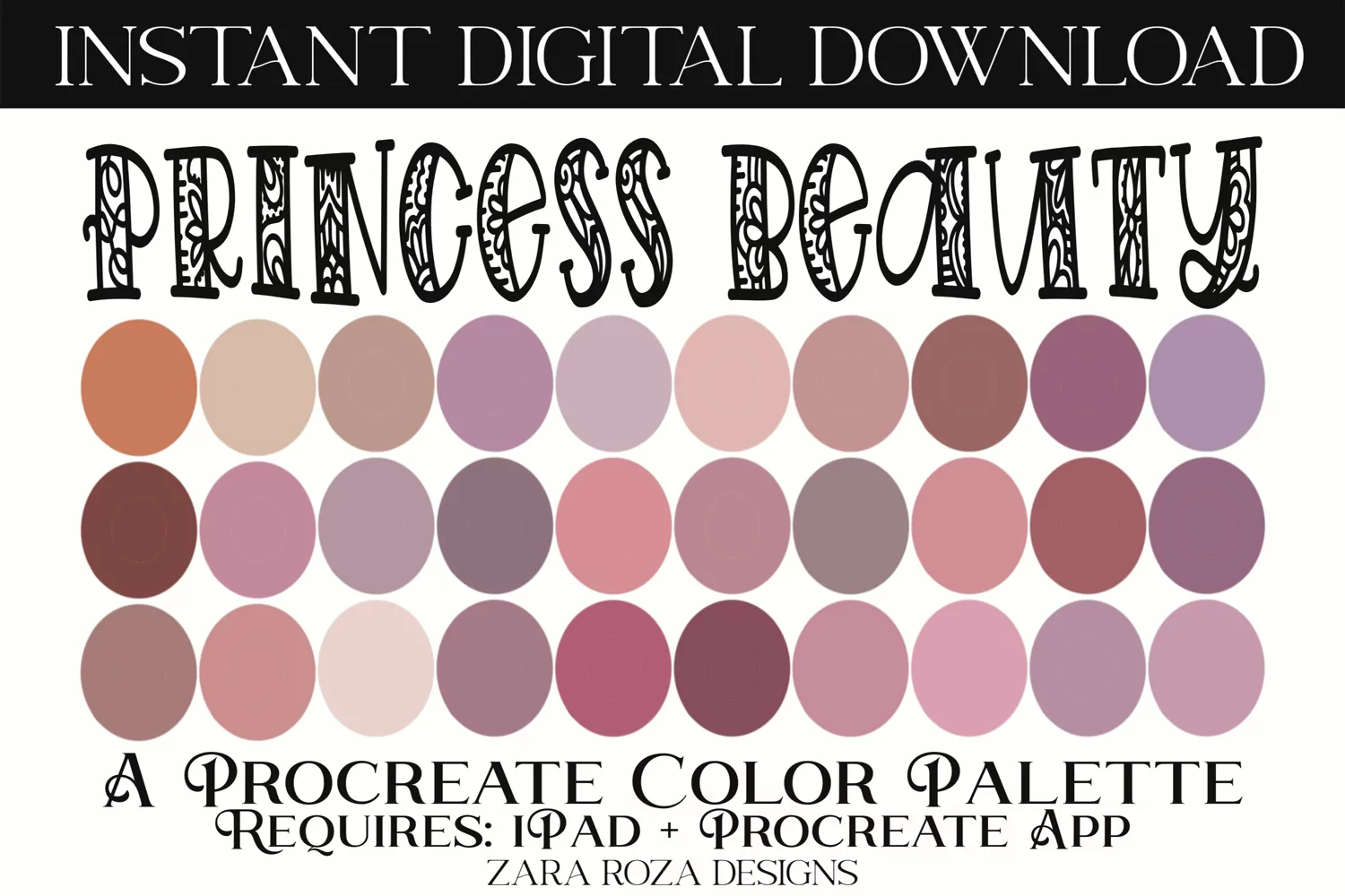 Princess Beauty Procreate Color Palette – A colourful boho colour / color palette tool with 30 swatches with bright, bold, soft, muted, light, muted, pale, pastel, cool, warm 70s 80s 90s retro tones & shades for digital artists, graphic design, calligraphy, drawing, illustrating / illustration, painting, portrait art, landscape sketching faces, hand lettering, graphic design, calligraphy, digital art, makeup, lipstick, lips, eye shadow, eyes, blush, contouring, nail art. 30 swatches – beige, orange, red, pink, magenta, brown, plum, iris, amethyst, lavender, mauve, lilac purple tones and colors handpicked to capture a retro vintage, cute, classy, sweet, earthy, nature, floral, flower, 70s 80s 90s, pastel, boho, artsy charm, elegant mood, vibes and aesthetic for digitally painting makeup, nature, water, trees, forests, floral swatches, flowers, gardens, parks, etc.