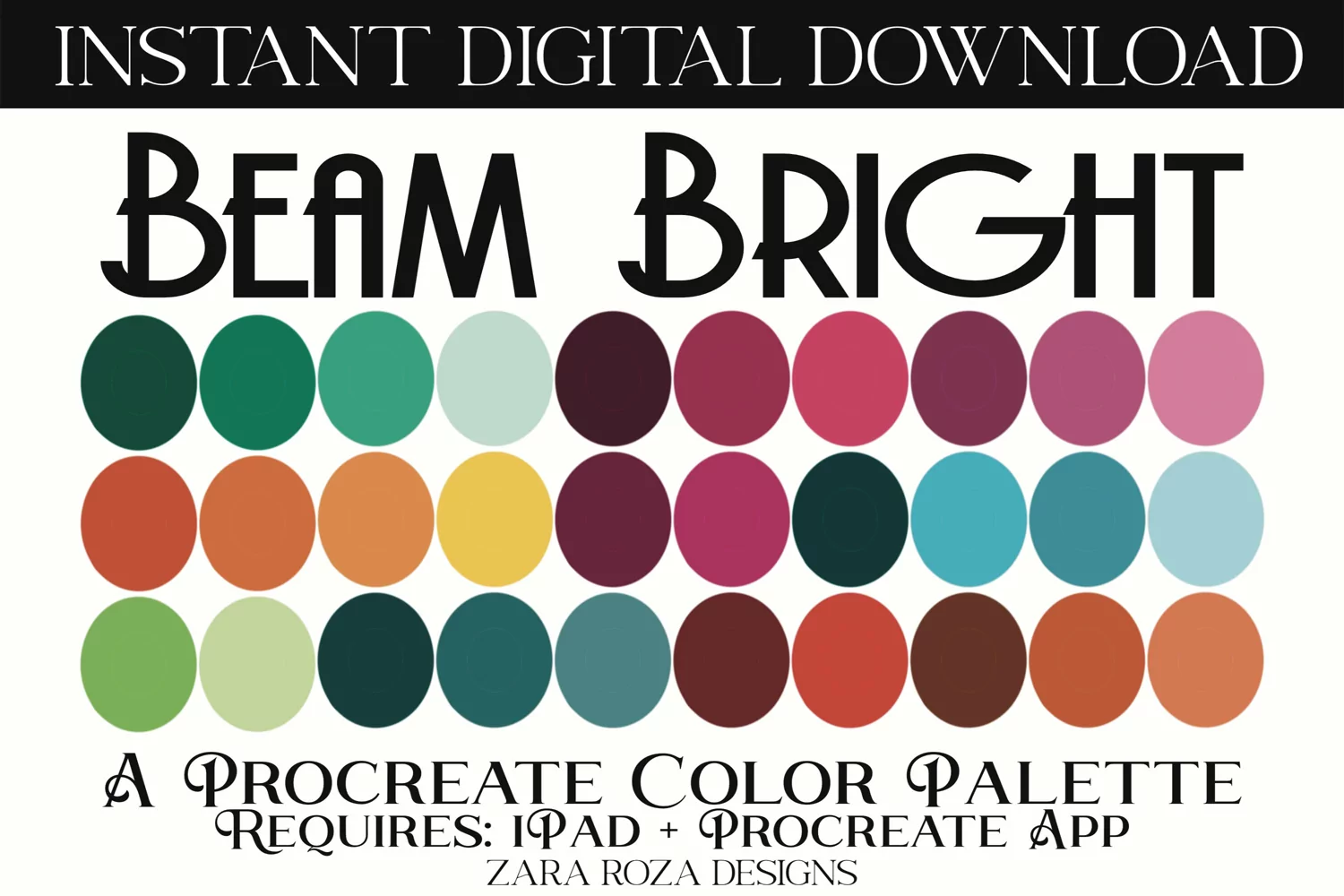 Beam Bright Procreate Color Palette – A colourful boho rainbow colour / color palette tool with 30 swatches for digital artists, graphic design, calligraphy, drawing, illustrating / illustration, painting, portrait art, landscape sketching faces, hand lettering, graphic design, calligraphy, digital art, makeup, lipstick, lips, eye shadow, eyes, blush, contouring, nail art. 30 swatches – lemon, sun yellow, orange, red, hot pink, magenta, plum, iris, amethyst, lavender, mauve, lilac purple, teal, turquoise, blue, green tones and colors handpicked to capture a retro vintage, cute, classy, sweet, earthy, nature, floral, flower, 70s 80s 90s, pastel, boho, artsy charm, elegant mood, vibes and aesthetic for digitally painting makeup, nature, water, trees, forests, floral swatches, flowers, gardens, parks, etc.