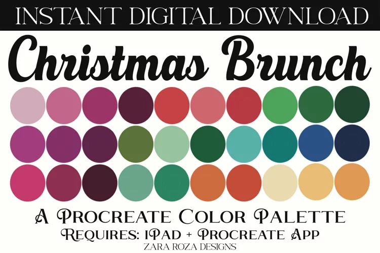Christmas Brunch – A Procreate app colour / color palette. This app add-on tool is 1 light, dark, bright, yellow, orange, brown, red and green gradient tones & shades Xmas holiday season inspired color scheme with 30 swatches, handpicked for a calm, relaxing, hippie, elegant, cute, 70s 80s 90s boho, modern, minimalist, summer, winter holiday festive celebration, Secret Santa celebrations & presents, last minute gift shopping, Christmas party vibes, retro vintage aesthetic & mood consisting of pastel light, dark, blue, purple, pink, red and green tones & shades for drawing, painting, illustrating, portrait art, digital art, graphic design, iPad hand lettering, calligraphy, writing, food, landscape, planning, sketching, logos, prints, layouts, comics, business shop branding, icons, logos, posts for social media, Instagram, Facebook, Twitter, Pinterest, Youtube, doodling, and more. Also can be used for procreate portraits, faces, character design, costume design, lipstick, eye shadow, lips, eyes, facial makeup, nail art, blush, line art, abstract art, sketches, artwork, illustrations, etc.