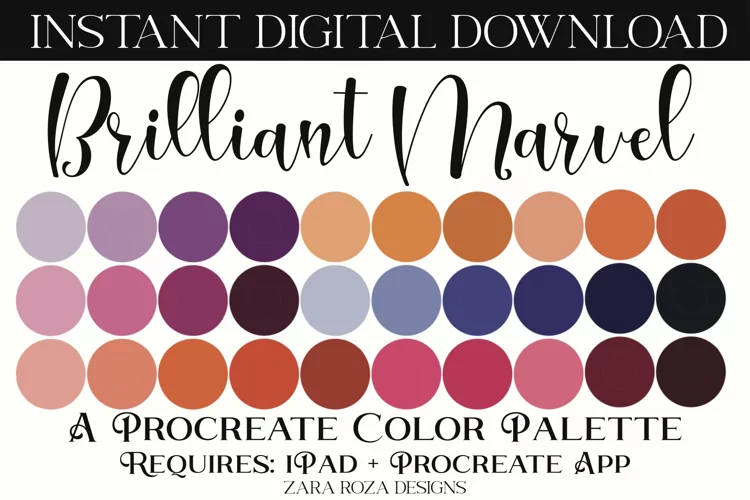 Brilliant Marvel - A Halloween themed Procreate colour / color palette. This app add-on tool is 1 color scheme with 30 swatches, handpicked purple, orange, pink, coral red, navy blue, green, teal, turquoise, brown, iris, lavender, amethyst, mauve, magenta tones for a classy, elegant, glam, calm, relaxing, hippie, bright Halloween trick or treat spooky, scary, goth, gothic, emo, light, pale, bold, bright, pastel, dark, quirky, magic, witch, wizard, sorcerer, fairy magical vibes, sunny summer, spring, winter, fall, autumn, Thanksgiving holiday, earthy tones, elegant, cute, retro vintage, 70s 80s 90s boho, modern, minimalist, bohemian, travel, wanderlust, aesthetic & mood consisting of tones & shades for drawing, painting, illustrating, portrait art, digital art, graphic design, iPad hand lettering, calligraphy, writing, food, landscape, planning, sketching, logos, prints, layouts, comics, doodling, and more. Also can be used for procreate portraits, faces, eyes, eye shadow, lips, lipstick, rouge blush, natural hair colors, character design, costume design, lipstick, eye shadow, lips, eyes, facial makeup, nail art, blush, line art, abstract art, fashion design, character art, backgrounds, scrapbook elements, social media, Facebook, Twitter, Instagram, branding, logos, business cards, posts, drawing, doodling, illustrating, painting, digital illustration & lettering. sketches, artwork, illustrations, etc.