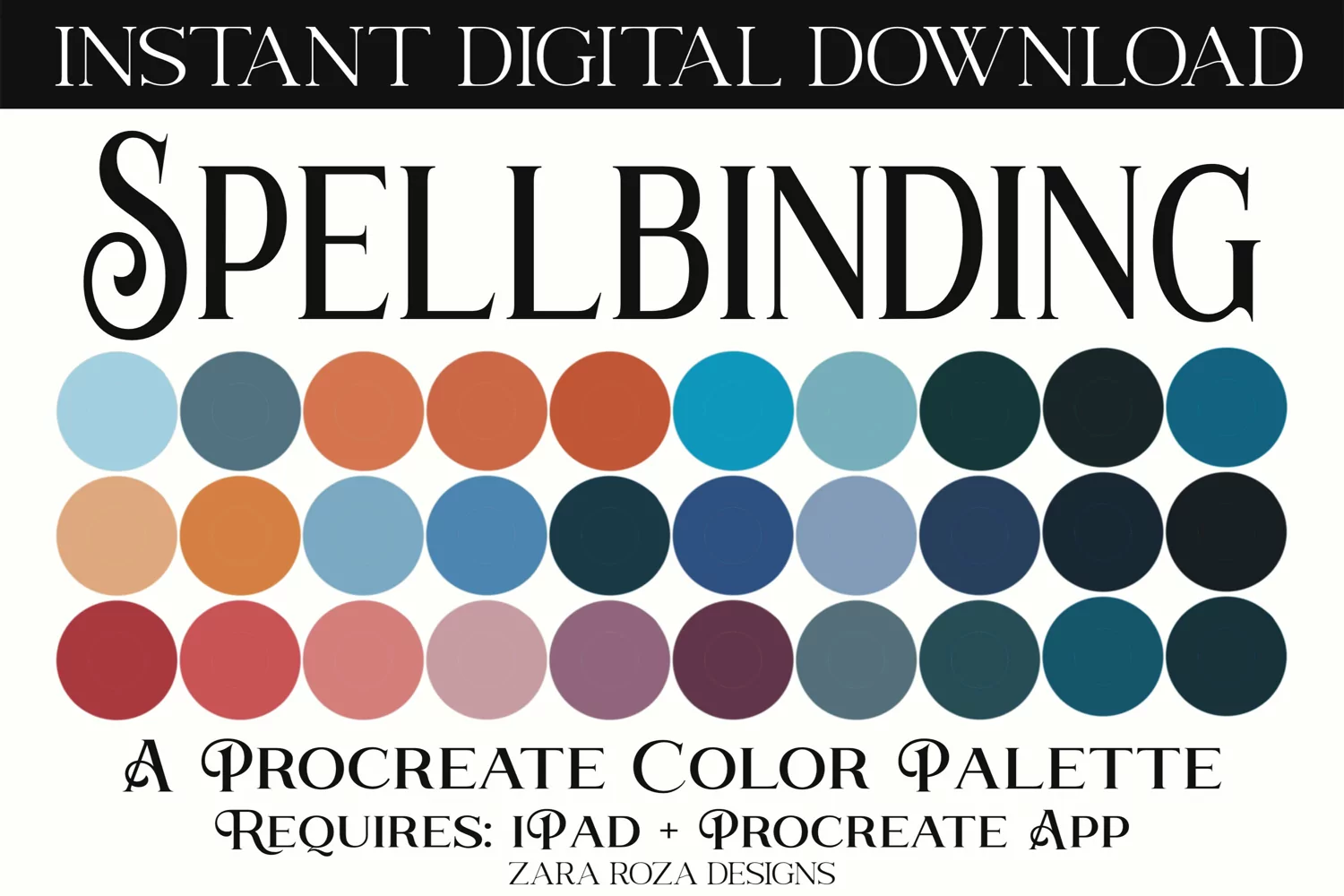 Spellbinding – A light, dark, retro vintage sky blue, deep azure, orange, brown, red, purple, blue, green, teal, turquoise, fairytale, dark academia, light academia, fairy, witch, magic, witchcraft, Halloween, wanderlust, travel, nautical, ocean, sea, maritime, map, wonder, nature, landscape art tones and shades colour / color palette tool of 30 swatches for painting & drawing in the procreate app with digital brushes. A calm, cosy / cozy, relaxing, warm, cool, light, dark, pastel, pale, ocean, nature, forest, natural eye color, nature, floral retro vintage green, teal, turquoise, earthy brown, purple, magenta, blue tones for digital artists, graphic design, calligraphy, drawing, illustrating / illustration, painting, portrait art, landscape art, sketching, lettering, graphic design, calligraphy, digital art, delicious food art, makeup, lipstick, lips, eye shadow, eyes, nail art. Handpicked colors to capture a retro vintage, cute, classy, elegant, sweet, earthy, nature, floral, flower, 70s 80s 90s, pastel, boho, artsy charm, elegant mood, vibes & aesthetic for digital illustration.