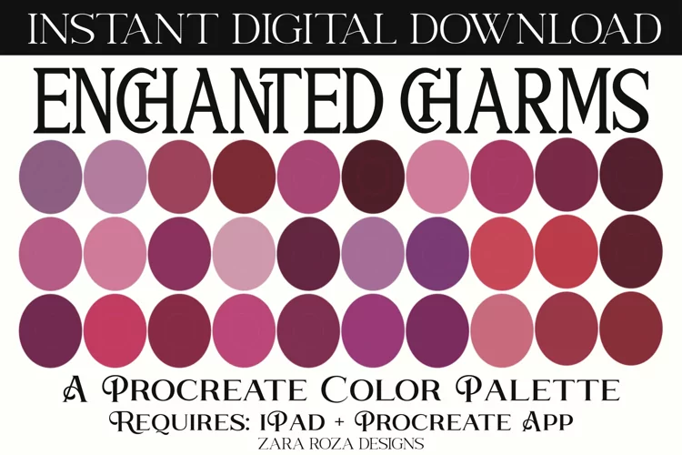 Enchanted Charms – A magical playful light dark pastel, bright, dark academia, portrait art makeup, gothic pink, blush, coral red, purple, mauve, aubergine brown, jewel, boho, fantasy, cute, retro vintage, as well as Halloween, witch, witchy, magic,magical, fairy, fairytale, trick or treat, emo, holiday, gothic, goth, magical, spooky, enchanted, grungy, abstract, dark academia bookish, magic vibes color palette tool of 30 swatches for painting & drawing in the procreate app with digital brushes. For classy makeup tones, nature, food art, floral retro vintage tones for digital artists, graphic design, calligraphy, drawing, illustrating / illustration, painting, portrait art, landscape art, sketching, lettering, graphic design, calligraphy, digital art, makeup, blush, shading, highlighting, lipstick, lips, eye shadow, nail art. Handpicked colors to capture a retro vintage, cute, classy, elegant, sweet, earthy, nature, floral, flower, 70s 80s 90s, pastel, boho, artsy charm, elegant mood, vibes & aesthetic for graphic design, backgrounds, scrapbook elements, social media, Facebook, Twitter, Instagram, branding, logos, business cards, posts, drawing, doodling, illustrating, painting, digital illustration & lettering.