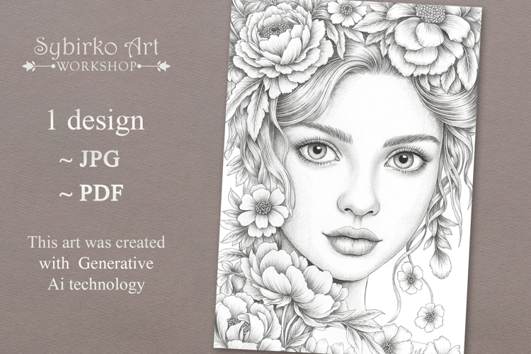 Flowers Girl coloring page for adults. Adult coloring page example image 1